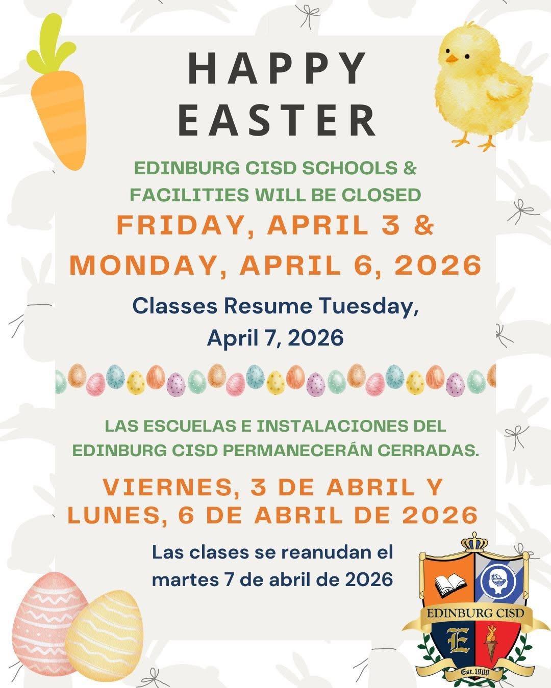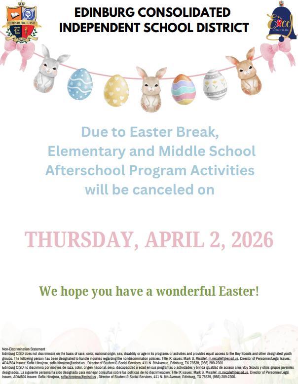 No School Friday, and Monday, April 3rd and 6th No ASP Thursday